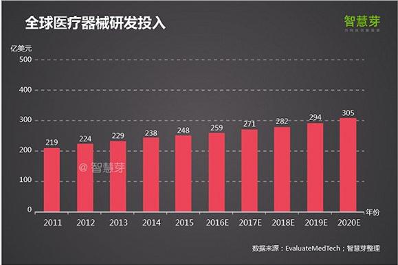 與此同時,全球醫(yī)療器械市場的研發(fā)投入也保持著穩(wěn)定增長態(tài)勢,2015年達(dá)到248億美元。