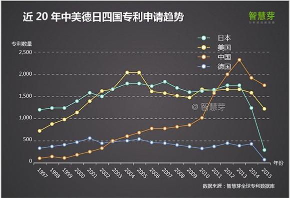 3.近20年中美日德四國的專利申請趨勢(圖表最好改大一點(diǎn),并把幾個國家代碼改為國家名稱。如:jp-日本,us-美國,cn-中國,de-德國)