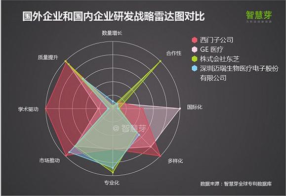 本次分析中我們以深圳邁瑞公司為例,對比國內(nèi)企業(yè)與國外“三巨頭”德國西門子,美國通用和日本東芝公司在高端影像醫(yī)學(xué)設(shè)備領(lǐng)域的專利的多項(xiàng)指標(biāo)進(jìn)行對比,從而挖掘出國內(nèi)企業(yè)和國外巨頭相比,在研發(fā)策略上的異同。