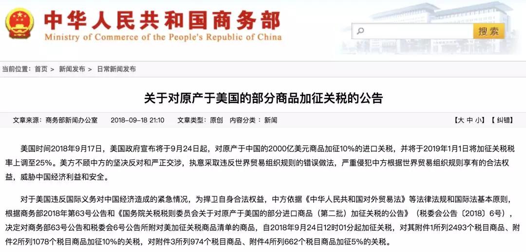 與此同時,商務(wù)部新聞發(fā)言人發(fā)表談話表示,為了維護自身正當權(quán)益和全球自由貿(mào)易秩序,中方將不得不同步進行反制。商務(wù)部公告稱,決定對商務(wù)部63號公告和稅委會6號公告所附對美加征關(guān)稅商品清單(中對美加征關(guān)稅第二批600億美元)的商品,自2018年9月24日12時01分起加征關(guān)稅。