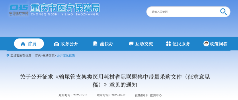 10月13日,重慶醫(yī)保局發(fā)布《關(guān)于公開征求<輸尿管支架類醫(yī)用耗材省際聯(lián)盟集中帶量采購文件(征求意見稿)>意見的通知》(以下簡稱《征求意見稿》)。