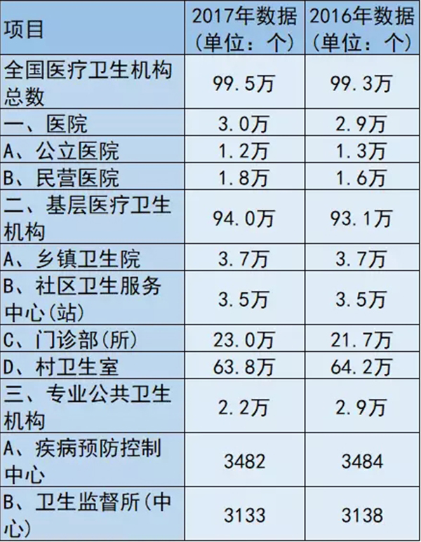 與之相對,在2017年內(nèi),全國公立醫(yī)院的數(shù)量比2016年又少了0.1萬個,村衛(wèi)生室少了0.4萬個。