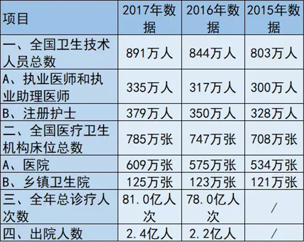 診所則一路從2010年的17.4萬個增長到2017年的23萬個,其中最近兩三年的增長幅度格外大,2016年一年增加了2.1萬個,2017年又增加了1.3萬個。