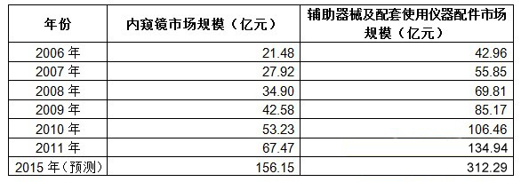 隨著內(nèi)窺鏡微創(chuàng)技術(shù)的普及和內(nèi)窺鏡加工工藝的提高,內(nèi)窺鏡應(yīng)用已涉及普外科、耳鼻喉科、骨科、泌尿外科、婦科等幾乎所有科室,成為醫(yī)用不可或缺的診斷和手術(shù)設(shè)備,也是全球醫(yī)療器械產(chǎn)業(yè)中增長最快的產(chǎn)品之一。發(fā)展中國家醫(yī)療水平的提高和醫(yī)療投資的加大,使內(nèi)窺鏡應(yīng)用不再局限于歐美發(fā)達(dá)國家,中國、印度、巴西等發(fā)展中國家市場需求量正快速增長。2011年全球醫(yī)用內(nèi)窺鏡市場規(guī)模為61億美元,預(yù)計(jì)到2016年將增長到97億美元。2011年,我國醫(yī)用內(nèi)窺鏡行業(yè)工業(yè)總產(chǎn)值約為50.65億元元,凈進(jìn)口16.82億元,國內(nèi)實(shí)際需求量達(dá)到67.47億元,到2015年該數(shù)值有望增長到156.15億元。與醫(yī)用內(nèi)窺鏡市場需求量快速增長一致,我國微創(chuàng)手術(shù)器械、影像系統(tǒng)、冷光源等醫(yī)用內(nèi)窺鏡配套器械產(chǎn)業(yè)發(fā)展迅速,內(nèi)窺鏡配套器械市場規(guī)模保持在內(nèi)窺鏡市場規(guī)模的2倍左右,2011年達(dá)到134.97億元,預(yù)計(jì)2015年將增至312.29億元。