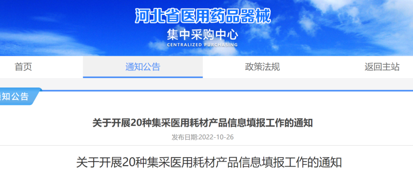 10月26日,河北省醫(yī)用藥品器械集中采購中心發(fā)布《關(guān)于開展20種集采醫(yī)用耗材產(chǎn)品信息填報(bào)工作的通知》,擬于近期組織開展人工骨填充材料等20種醫(yī)用耗材集中帶量采購,現(xiàn)組織開展相關(guān)產(chǎn)品信息填報(bào)工作。