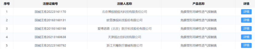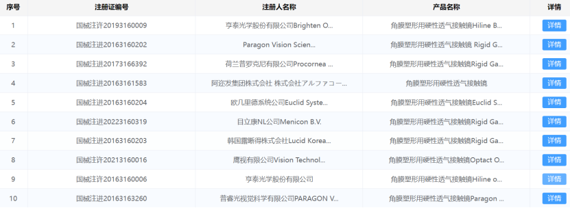 賽柏藍(lán)器械從國家藥監(jiān)局官網(wǎng)查詢了解到,據(jù)不完全統(tǒng)計(jì),目前國內(nèi)共有15款角膜塑形鏡獲批,其中10款為進(jìn)口。歐普康視、愛博醫(yī)療、天津視達(dá)佳、北京博視頓、浙江天瞳等5家企業(yè)擁有國產(chǎn)角膜塑形鏡注冊(cè)證,歐普康視、愛博醫(yī)療獲批較早,其余3家均為近兩年獲批。