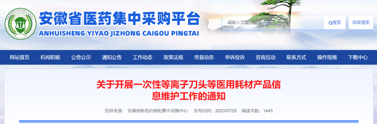 近日,安徽省醫(yī)藥價(jià)格和集中采購中心發(fā)布《關(guān)于開展一次性等離子刀頭等醫(yī)用耗材產(chǎn)品信息維護(hù)工作的通知》(簡稱《通知》)。