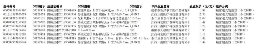 一次性使用精密輸液器擬中選企業(yè)包括成都市新津事豐醫(yī)療器械有限公司、江西三鑫醫(yī)療科技股份有限公司、浙江康泰醫(yī)療器械有限公司等,上述三家企業(yè)報價分別為1.92元、2.36元、2.68元。