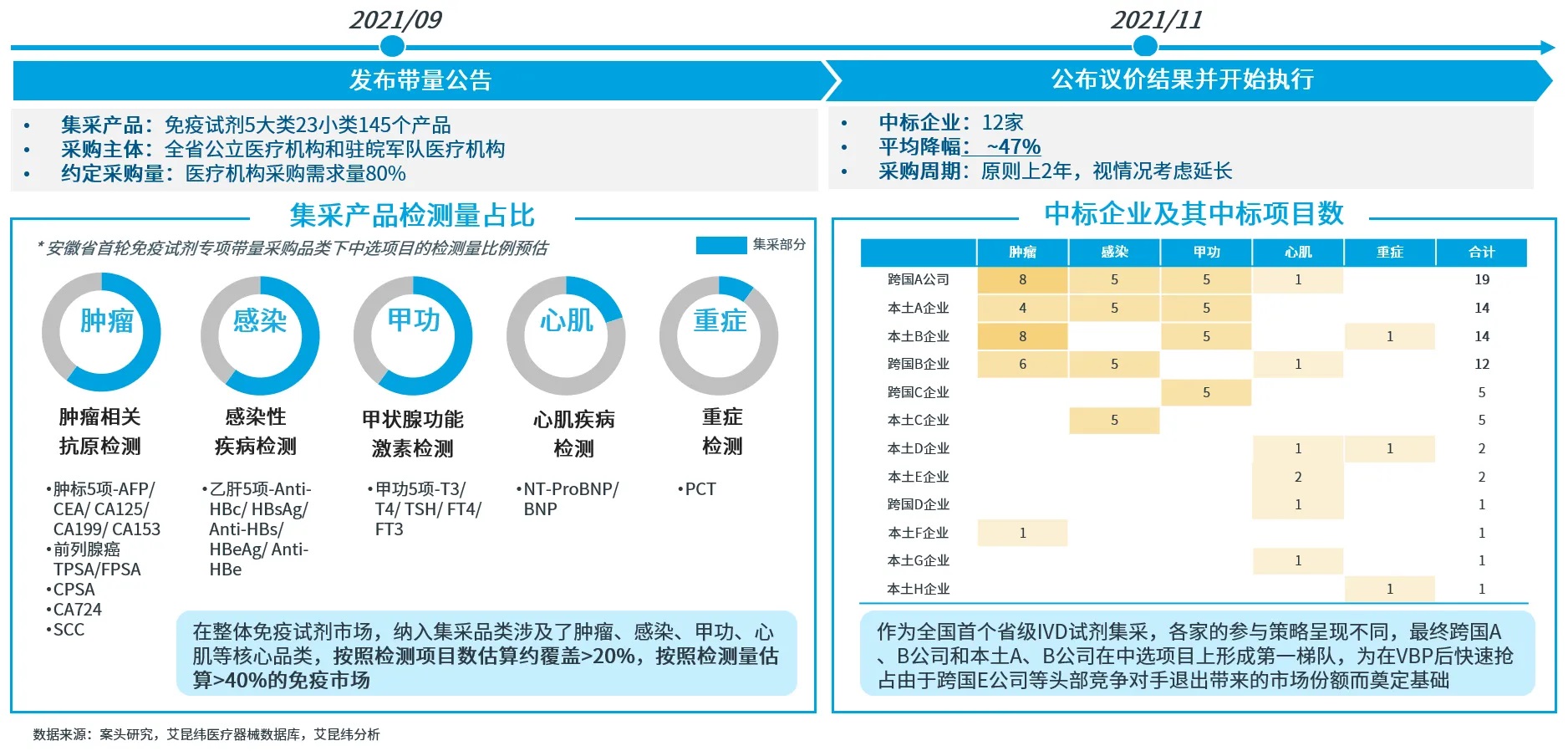 早在2021年,安徽曾遴選了腫瘤相關(guān)抗原測(cè)定、感染性疾病實(shí)驗(yàn)檢測(cè)、心肌疾病實(shí)驗(yàn)診斷、激素測(cè)定、降鈣素原檢測(cè)共5大類23小類開(kāi)展過(guò)省級(jí)試點(diǎn)集采,平均降幅達(dá)47.02%。
