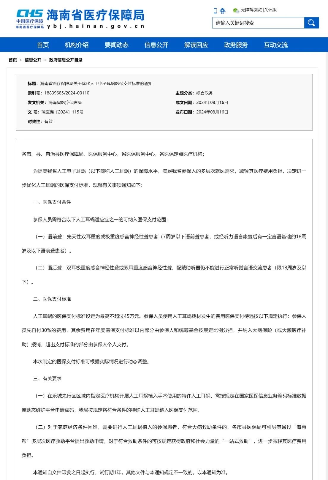 此外,在海南省樂城先行區(qū)區(qū)域內(nèi)指定醫(yī)療機構(gòu)開展人工耳蝸植入手術(shù)使用的特許人工耳蝸,需按規(guī)定在國家醫(yī)保信息業(yè)務(wù)編碼標準數(shù)據(jù)庫動態(tài)維護平臺申請賦碼,海南醫(yī)保局按規(guī)定將符合條件的特許人工耳蝸納入醫(yī)保支付范圍。