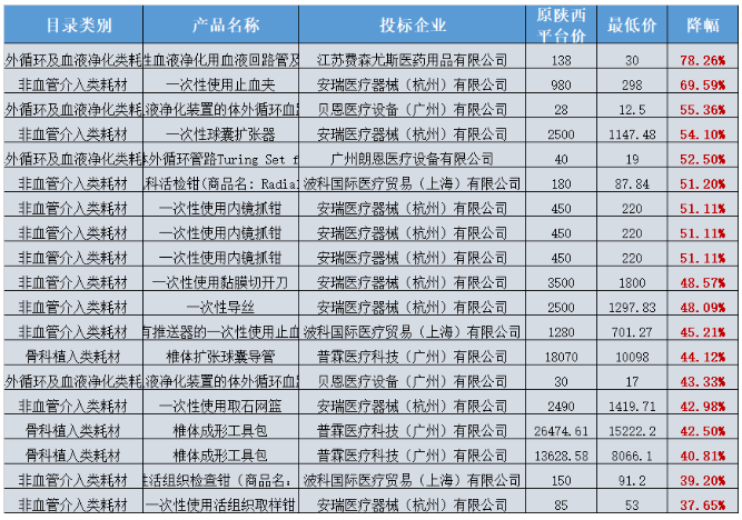 除此之外,本次還有雅培、波科國際、上海微創(chuàng)、樂普、庫克、費森尤斯等22家企業(yè)118種高值耗材價格再度調(diào)低,最高降幅高達78%。