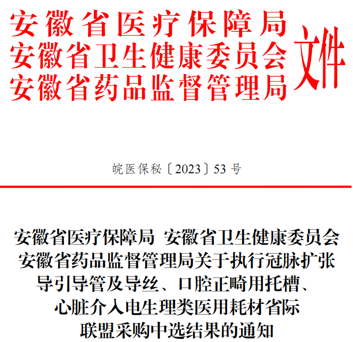 近日,安徽省醫(yī)保局、省衛(wèi)健委、省藥監(jiān)局三部門聯(lián)合發(fā)布“關(guān)于執(zhí)行冠脈擴張導引導管及導絲、口腔正畸用托槽、心臟介入電生理類醫(yī)用耗材省際聯(lián)盟采購中選結(jié)果的通知”。