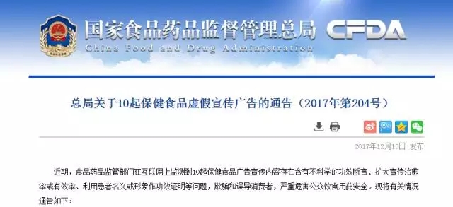 這不,這一次,CFDA又調(diào)查、處罰了一批問題企業(yè)。12月15日,國家食藥監(jiān)總局通告10起保健食品虛假宣傳廣告。通報(bào)稱,這些廣告中使用諸如“無藥勝藥,屢見神效”、“抑制癌細(xì)胞擴(kuò)散率達(dá)89.3%”、“ 除藥物之外見效最快”等內(nèi)容,欺騙和誤導(dǎo)消費(fèi)者。食藥監(jiān)部門已將其違法行為通報(bào)有關(guān)部門查處,并依法收回其有效期內(nèi)的廣告批準(zhǔn)文號,責(zé)令產(chǎn)品暫停銷售。