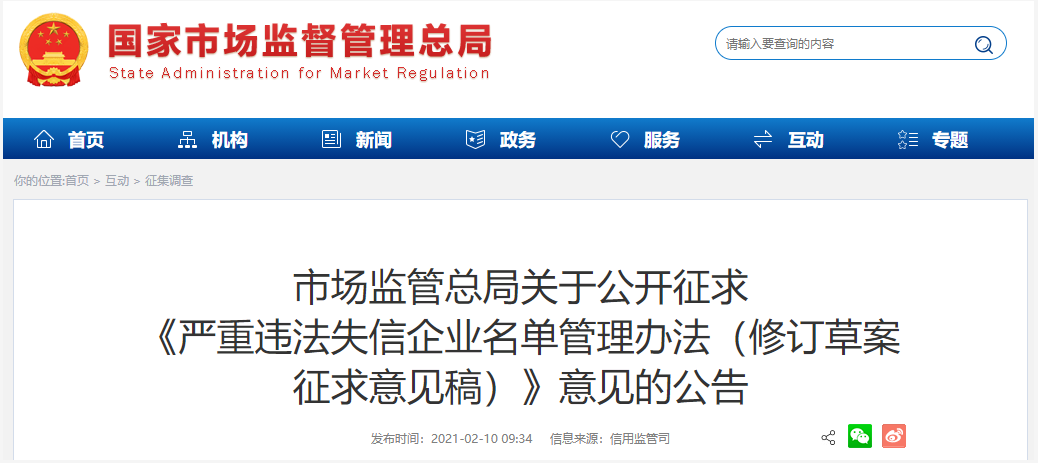 近日,國(guó)家市場(chǎng)監(jiān)管總局最新發(fā)布了一則關(guān)于公開(kāi)征求《嚴(yán)重違法失信企業(yè)名單管理辦法(修訂草案征求意見(jiàn)稿)》意見(jiàn)的公告(以下簡(jiǎn)稱《公告》)。
