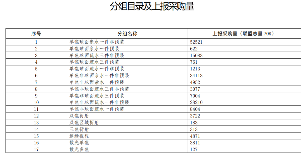 本次聯(lián)合帶量采購品種為人工晶體,采購周期為一年,對于采購產(chǎn)品分組,將按功能屬性,結(jié)合各省上報采購量,確定產(chǎn)品分組目錄,其中單焦晶體11組,多焦晶體4組,散光晶體2組。