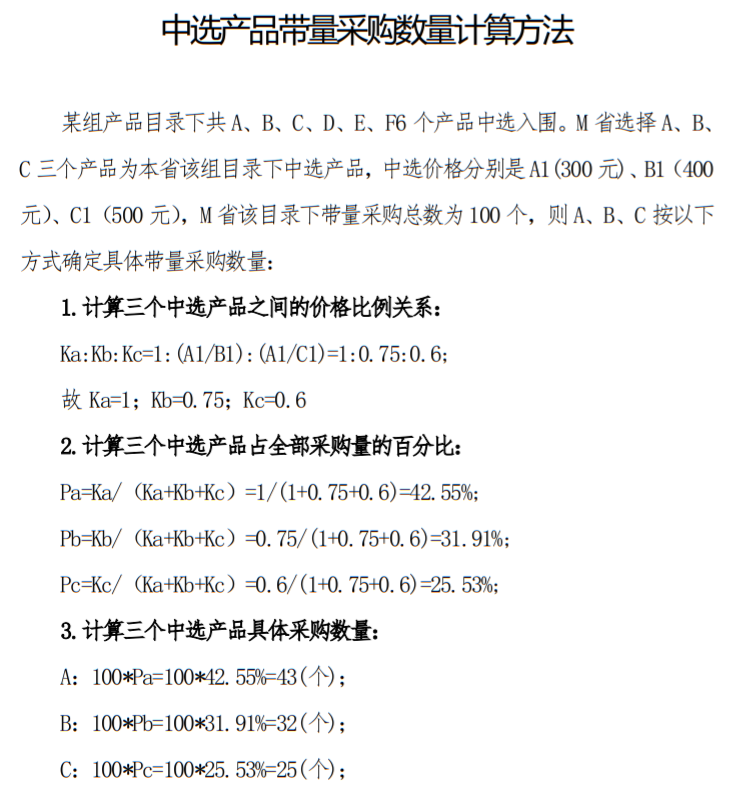 每個省(區(qū))從各組的中選產(chǎn)品中,確定本省該組的中選產(chǎn)品后,按中選產(chǎn)品價格之間的比例關(guān)系,具體計算每個中選產(chǎn)品的采購數(shù)量,舉例如下: