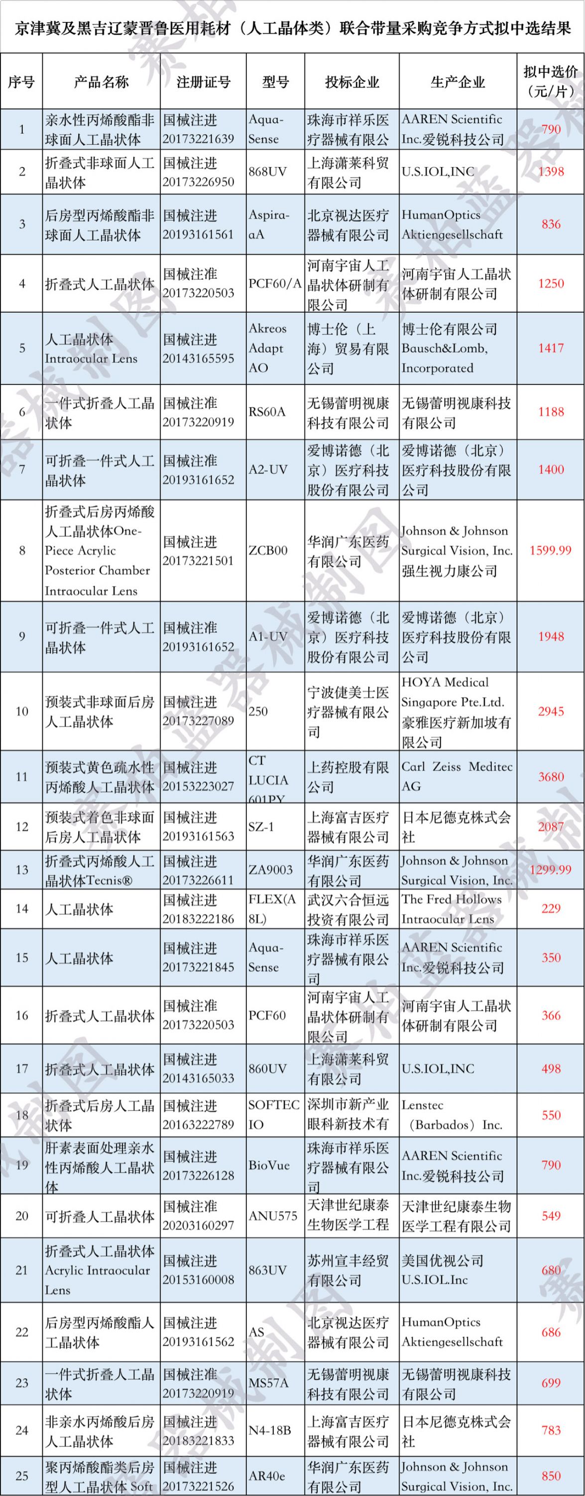 今年5月,京津冀及黑吉遼蒙晉魯醫(yī)藥聯(lián)合采購辦公室公布人工晶體類耗材中選結(jié)果,中選企業(yè)包括強生視力康、愛博諾德、美國愛爾康、無錫蕾明視康等企業(yè)(文末附中標企業(yè)及價格名單)。