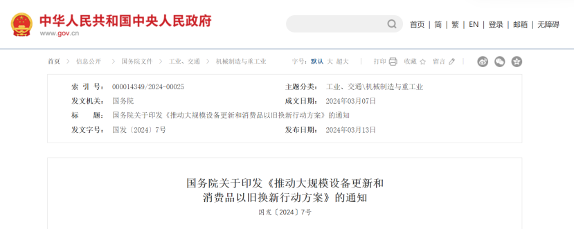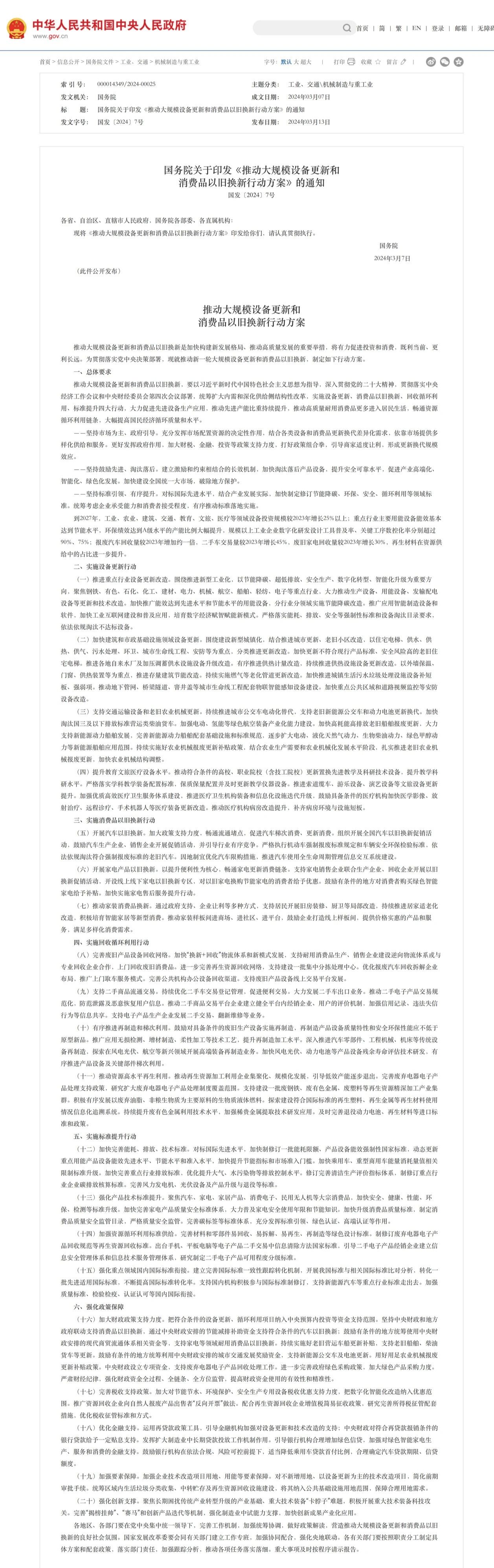 3月13日,國(guó)務(wù)院發(fā)布《推動(dòng)大規(guī)模設(shè)備更新和消費(fèi)品以舊換新行動(dòng)方案》(以下簡(jiǎn)稱《方案》)。其中指出,到2027年,工業(yè)、農(nóng)業(yè)、建筑、交通、教育、文旅、醫(yī)療等領(lǐng)域設(shè)備投資規(guī)模較2023年增長(zhǎng)25%以上(文末附全文)。