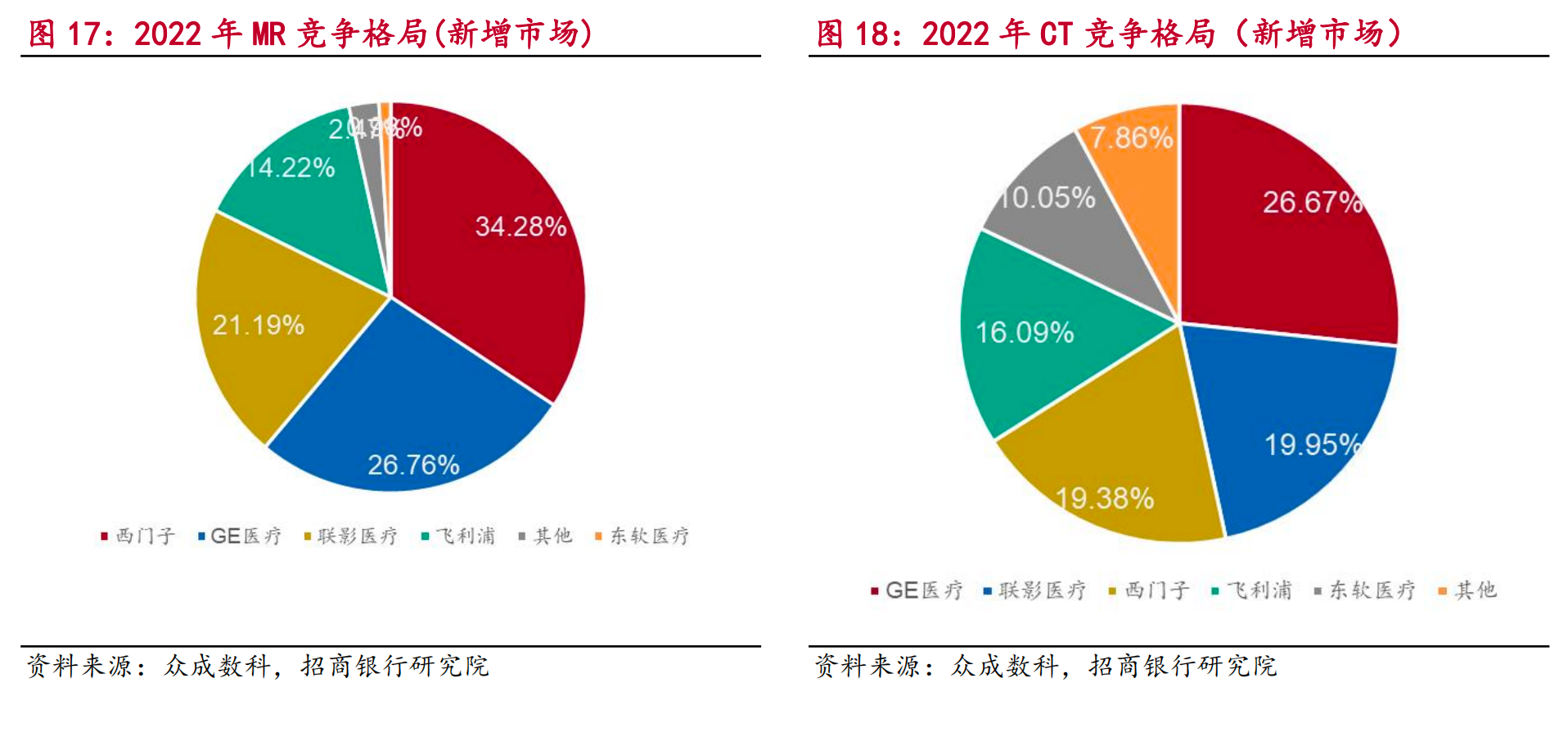 對(duì)醫(yī)學(xué)影像設(shè)備細(xì)分市場(chǎng)新增市場(chǎng)競(jìng)爭(zhēng)格局進(jìn)行統(tǒng)計(jì),2022 年各細(xì)分賽道國(guó)產(chǎn)化率較高的細(xì)分領(lǐng)域?yàn)?US、CT、PET-CT、MR,但國(guó)產(chǎn)化率均在 20-40%之間。