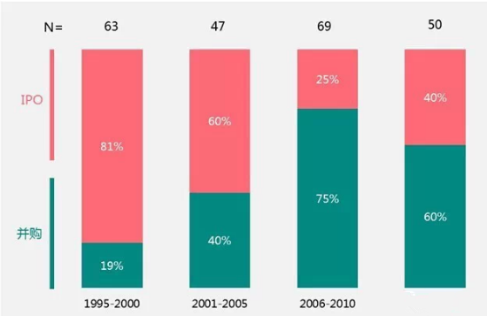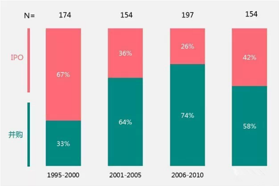 而2006-2010年段,在所有規(guī)模的風(fēng)投退出方式中,并購方式超過75%,盡管2013年IPO方式改寫了這一數(shù)字,但仍然未能撼動并購方式的主導(dǎo)地位,最近的幾年間,在大于2.5億美元的公司或項目中超過60%以并購方式退出,并購企業(yè)的含金量已經(jīng)大幅度提升。