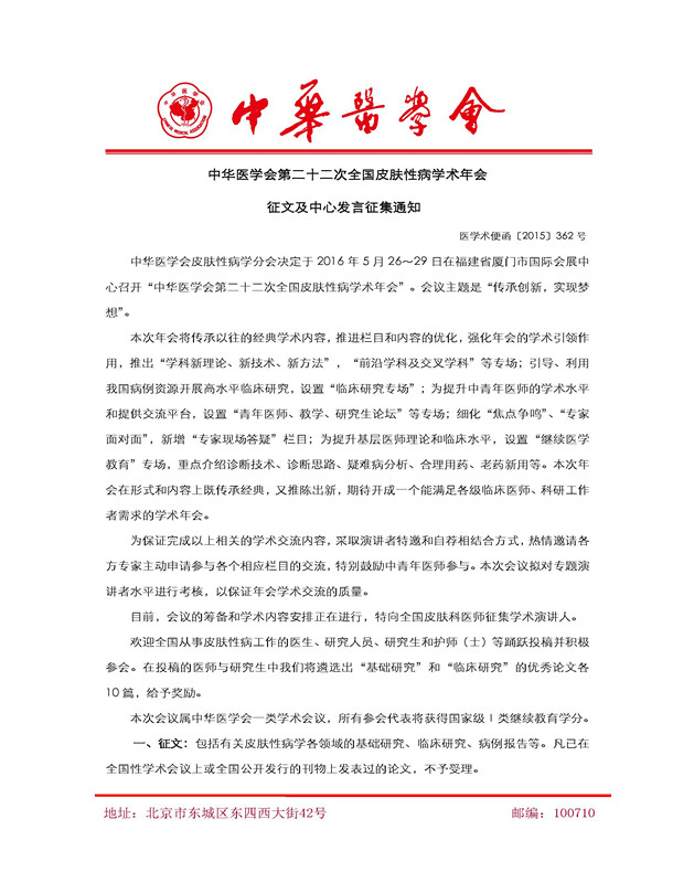 中華醫(yī)學(xué)會皮膚性病學(xué)分會決定于2016年5月26~29日在福建省廈門市國際會展中心召開“中華醫(yī)學(xué)會第二十二次全國皮膚性病學(xué)術(shù)年會”。會議主題是“傳承創(chuàng)新,實現(xiàn)夢想”。