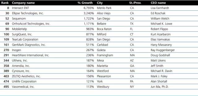 和往年一樣,快到11月底的時候,德勤公布了2015年北美區(qū)高科技成長企業(yè)500強(qiáng)名單,企業(yè)占比最多的依然來自軟件開發(fā)行業(yè),較少的為儀器儀表行業(yè)。動脈網(wǎng)第一時間為大家梳理了其中行業(yè)為醫(yī)療器械類的公司,共有十六家。