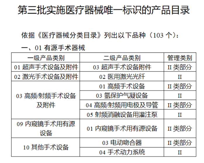 截至目前,第三類醫(yī)療器械的唯一標(biāo)識(shí)工作均已開展,第二類也在加緊推進(jìn)中。《公告》指出,按照風(fēng)險(xiǎn)程度和監(jiān)管需要,確定部分臨床需求量較大的一次性使用產(chǎn)品、集中帶量采購中選產(chǎn)品、醫(yī)療美容相關(guān)產(chǎn)品等部分第二類醫(yī)療器械作為第三批醫(yī)療器械唯一標(biāo)識(shí)實(shí)施品種。