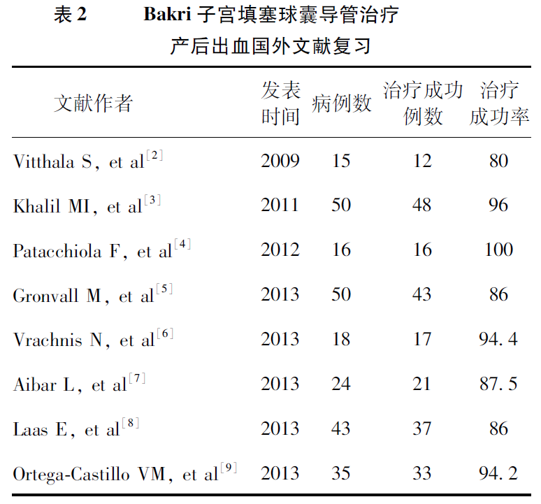 由于產(chǎn)后出血發(fā)病急,目前國(guó)內(nèi)外關(guān)于Bakri球囊導(dǎo)管治療產(chǎn)后出血尚無隨機(jī)對(duì)照研究,所有研究數(shù)據(jù)均來源于回顧性分析。近年國(guó)外學(xué)者報(bào)道,Bakri球囊導(dǎo)管治療產(chǎn)后出血成功率達(dá)80%~100%,見表2[2-9]。本研究中,使用Bakri球囊導(dǎo)管治療產(chǎn)后出血成功率為94%(60/64),與國(guó)外文獻(xiàn)報(bào)道大致相似。