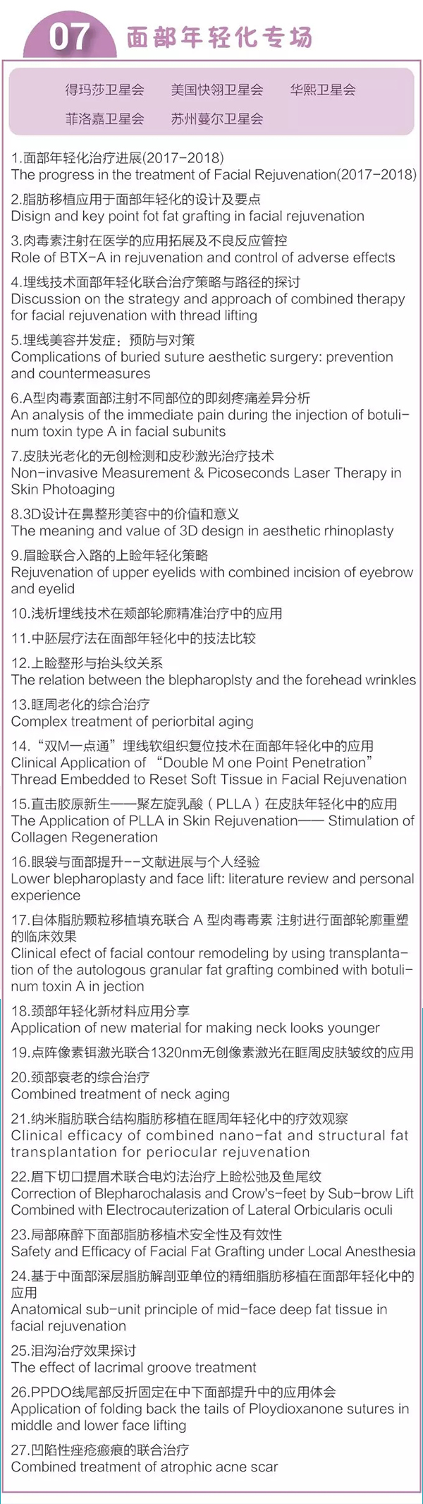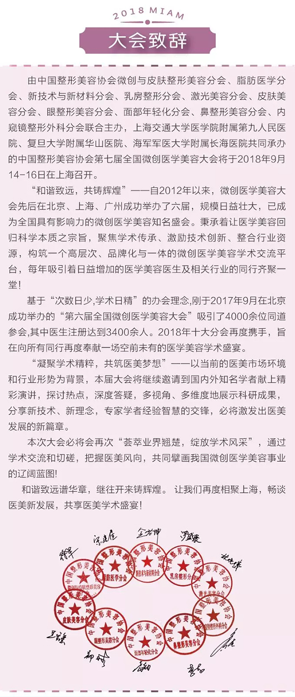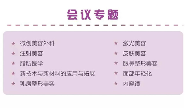 主辦單位:中國整形美容協(xié)會(huì)微創(chuàng)與皮膚整形美容分會(huì) · 脂肪醫(yī)學(xué)分會(huì)新技術(shù)與新材料分會(huì) · 乳房整形分會(huì)激光美容分會(huì) · 皮膚美容分會(huì)眼整形美容分會(huì) · 面部年輕化分會(huì)鼻整形美容分會(huì) · 內(nèi)窺鏡整形外科分會(huì)