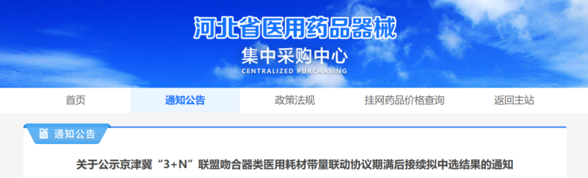 近日,河北省醫(yī)用藥品器械集中采購(gòu)中心發(fā)布《關(guān)于公示京津冀“3+N”聯(lián)盟吻合器類醫(yī)用耗材帶量聯(lián)動(dòng)協(xié)議期滿后接續(xù)擬中選結(jié)果的通知》。
