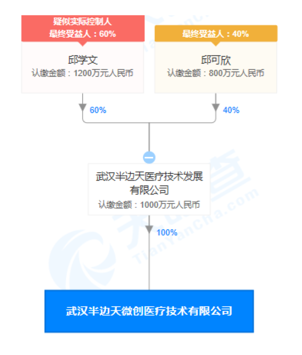 資料顯示,武漢半邊天微創(chuàng)醫(yī)療技術有限公司成立于2014年11月,注冊資本為1000萬元,實繳資本僅為50萬元。武漢半邊天醫(yī)療技術發(fā)展有限公司是其持股100%的控股股東,邱學文是法定代表人、執(zhí)行董事兼總經理。