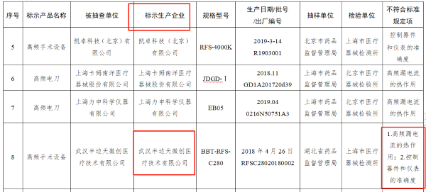 2020年7月27日,國家藥監(jiān)局發(fā)布的“關于發(fā)布國家醫(yī)療器械監(jiān)督抽檢結果的通告(第3號)(2020年第52號)”顯示,武漢半邊天微創(chuàng)醫(yī)療技術有限公司生產的“高頻手術設備”(型號BBT-RFS-C280)不符合標準規(guī)定,不符合標準規(guī)定項為“高頻漏電流的熱作用”、“控制器件和儀表的準確度”。