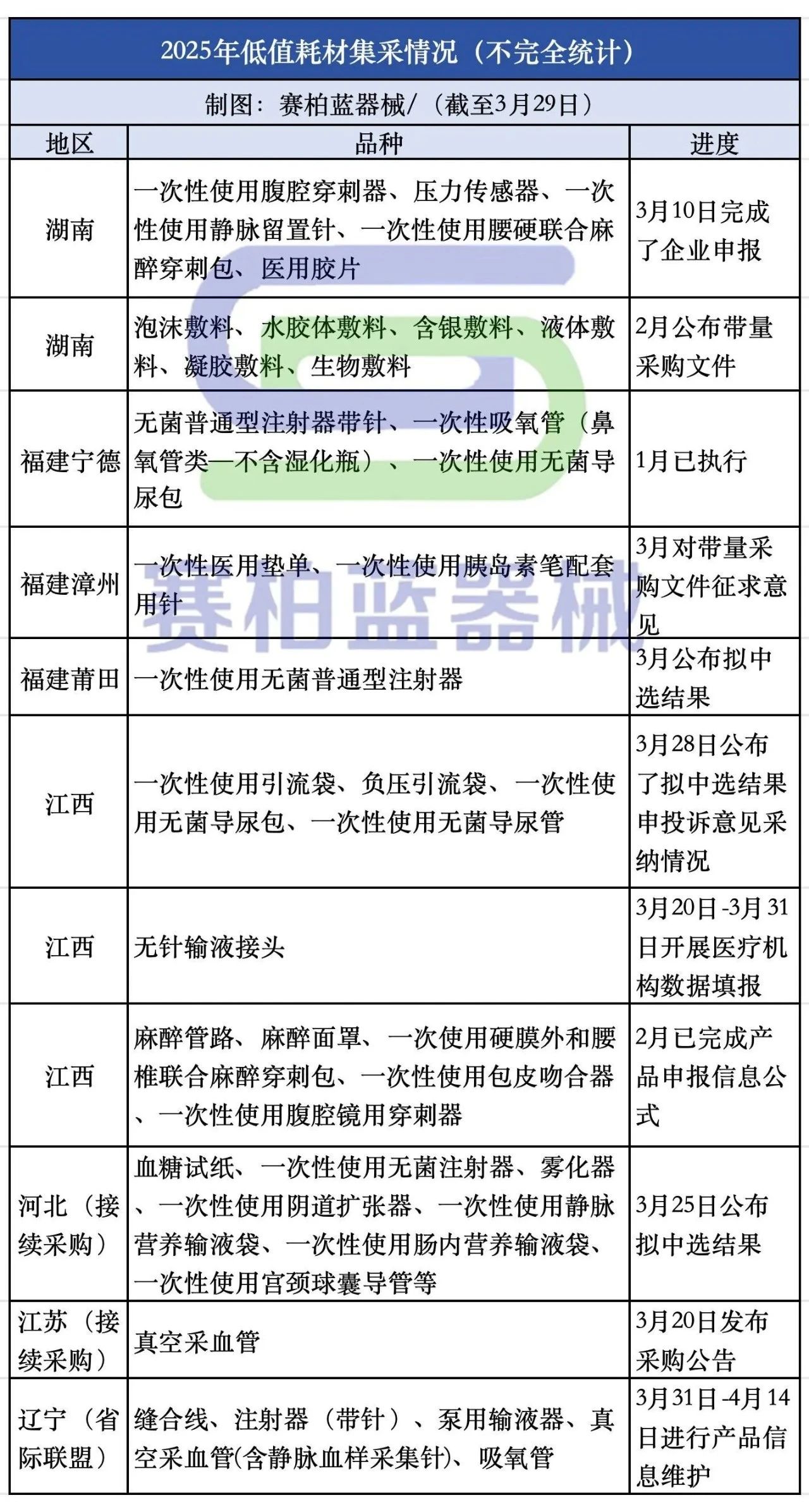 開(kāi)年以來(lái),低值耗材集采動(dòng)作密集。據(jù)賽柏藍(lán)器械梳理,截至目前已有湖南、江西、河北、江蘇、遼寧、福建等多地推進(jìn)低值耗材集采。