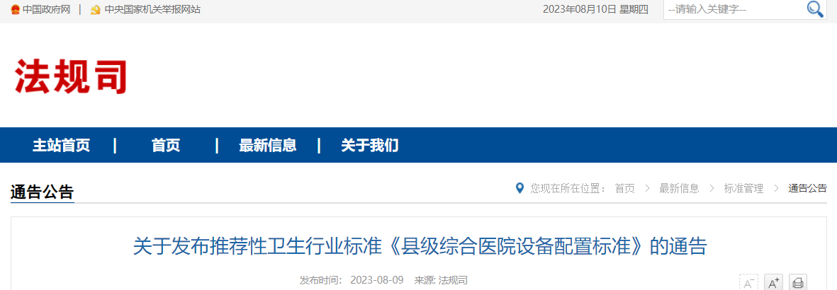8月9日,國家衛(wèi)健委發(fā)布推薦性衛(wèi)生行業(yè)標準《縣級綜合醫(yī)院設備配置標準》,自2024年1月1日起正式施行。