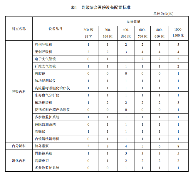 根據文件,不同規(guī)模的縣級綜合醫(yī)院臨床科室、醫(yī)技科室、輔助科室萬元以上設備配置數(shù)量可參照設備配置標準表執(zhí)行。萬元以下設備如輸注泵等,縣級綜合醫(yī)院根據自身發(fā)展需求進行配置。表中還規(guī)定了設備配置數(shù)量的最低標準,各縣級綜合醫(yī)院可根據規(guī)模和服務需求合理配置。