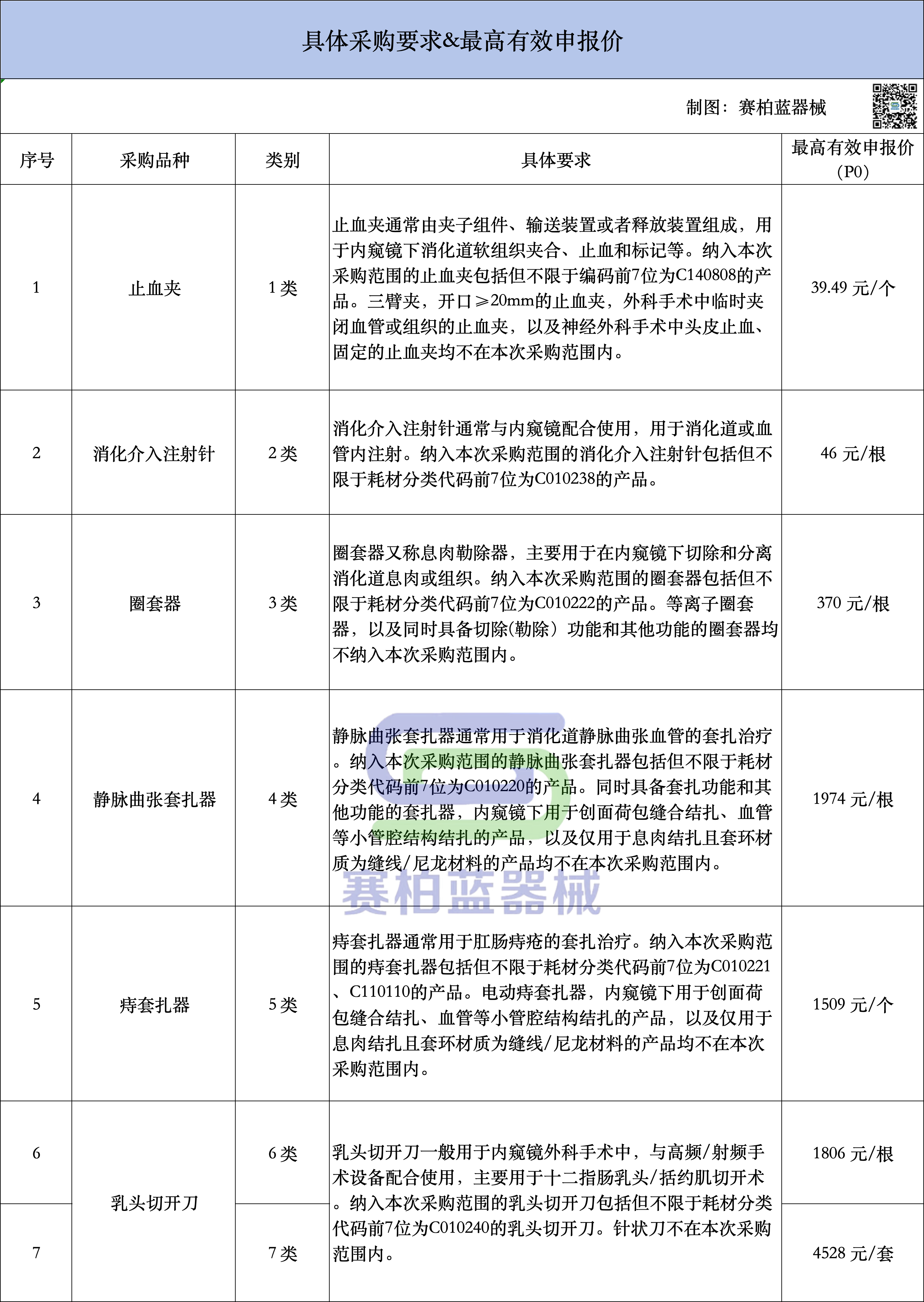 根據(jù)《公告》,此次采購品種包括:止血夾、消化介入注射針、圈套器、靜脈曲張?zhí)自鳌⒅烫自?、乳頭切開刀這6大品種(7大類別),并公布各自的最高有效申報價格,具體如下: