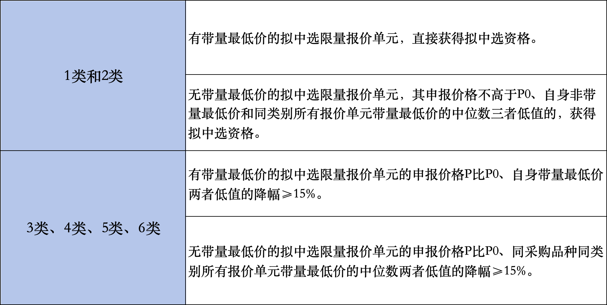 其中,在同采購品種同類別內(nèi)(1類到6類),符合企業(yè)報價要求的報價單元滿足以下條件之一的,獲得擬中選限量資格: