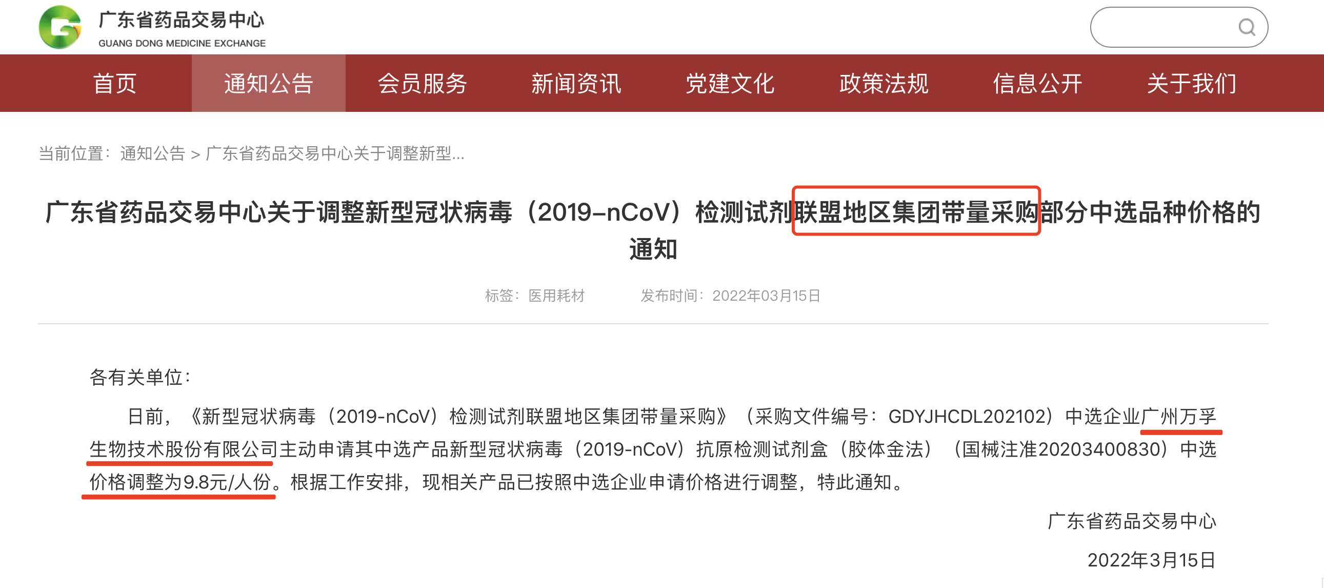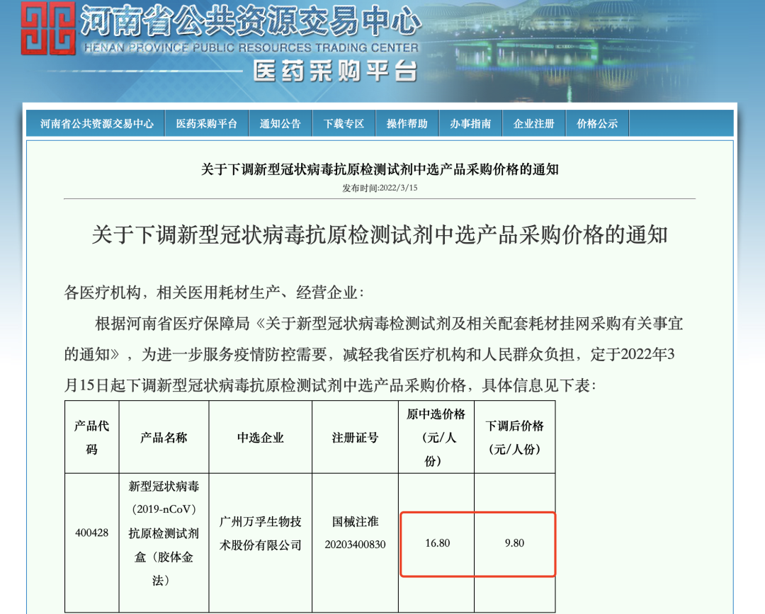3月15日,廣東省藥品交易中心發(fā)布《關(guān)于調(diào)整新型冠狀病毒(2019-nCoV)檢測(cè)試劑聯(lián)盟地區(qū)集團(tuán)帶量采購(gòu)部分中選品種價(jià)格的通知》。需要注意的是,中選企業(yè)廣州萬(wàn)孚生物技術(shù)股份有限公司主動(dòng)申請(qǐng)其中選產(chǎn)品新型冠狀病毒(2019-nCoV)抗原檢測(cè)試劑盒(膠體金法)(國(guó)械注準(zhǔn)20203400830)中選價(jià)格調(diào)整為9.8元/人份。