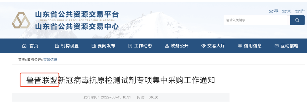 3月15日,山東省公共資源交易中心發(fā)布《魯晉聯(lián)盟新冠病毒抗原檢測(cè)試劑專(zhuān)項(xiàng)集中采購(gòu)工作通知》,山東省、山西省組成聯(lián)盟(簡(jiǎn)稱(chēng)魯晉聯(lián)盟),開(kāi)展新冠病毒抗原檢測(cè)試劑產(chǎn)品專(zhuān)項(xiàng)集中采購(gòu)工作。采購(gòu)主體是:符合新冠病毒抗原檢測(cè)要求的醫(yī)療機(jī)構(gòu)。