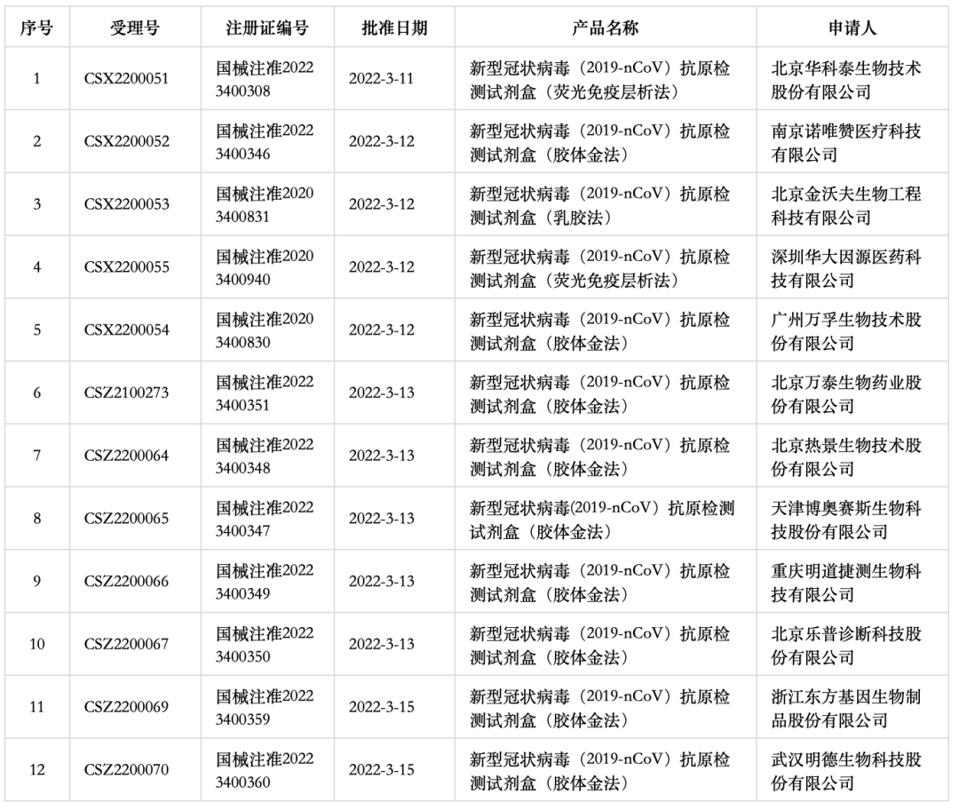 3月11日-13日,國(guó)家藥品監(jiān)督管理局醫(yī)療器械技術(shù)審評(píng)中心完成10個(gè)新冠抗原檢測(cè)產(chǎn)品應(yīng)急審評(píng),3月15日又完成2個(gè)新冠抗原檢測(cè)產(chǎn)品的應(yīng)急審評(píng)工作,并獲得國(guó)家藥監(jiān)局審批。