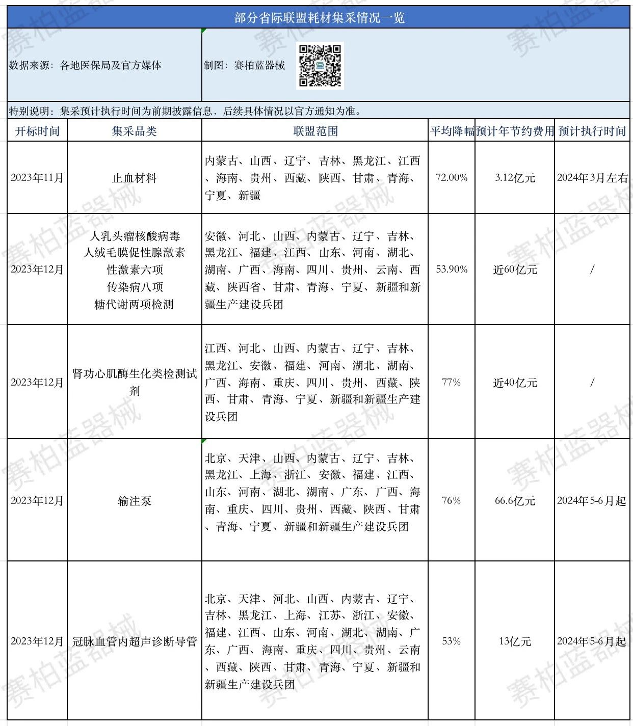 據(jù)賽柏藍(lán)器械觀察,在剛剛過(guò)去的一年間,耗材集采全國(guó)擴(kuò)圍。除前述提到的國(guó)采及種植牙集采外,關(guān)節(jié)骨水泥、冠脈導(dǎo)引導(dǎo)管/冠脈導(dǎo)引導(dǎo)絲、冠脈藥物球囊、止血材料、分子診斷及免疫診斷類試劑、腎功心肌酶生化試劑、輸注泵、冠脈血管內(nèi)超聲診斷導(dǎo)管等諸多耗材品類在全國(guó)多省開展了聯(lián)盟集采,中選產(chǎn)品降幅明顯。