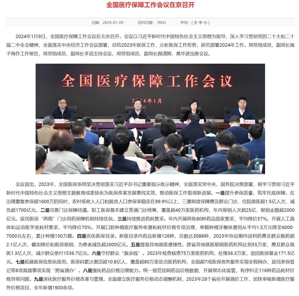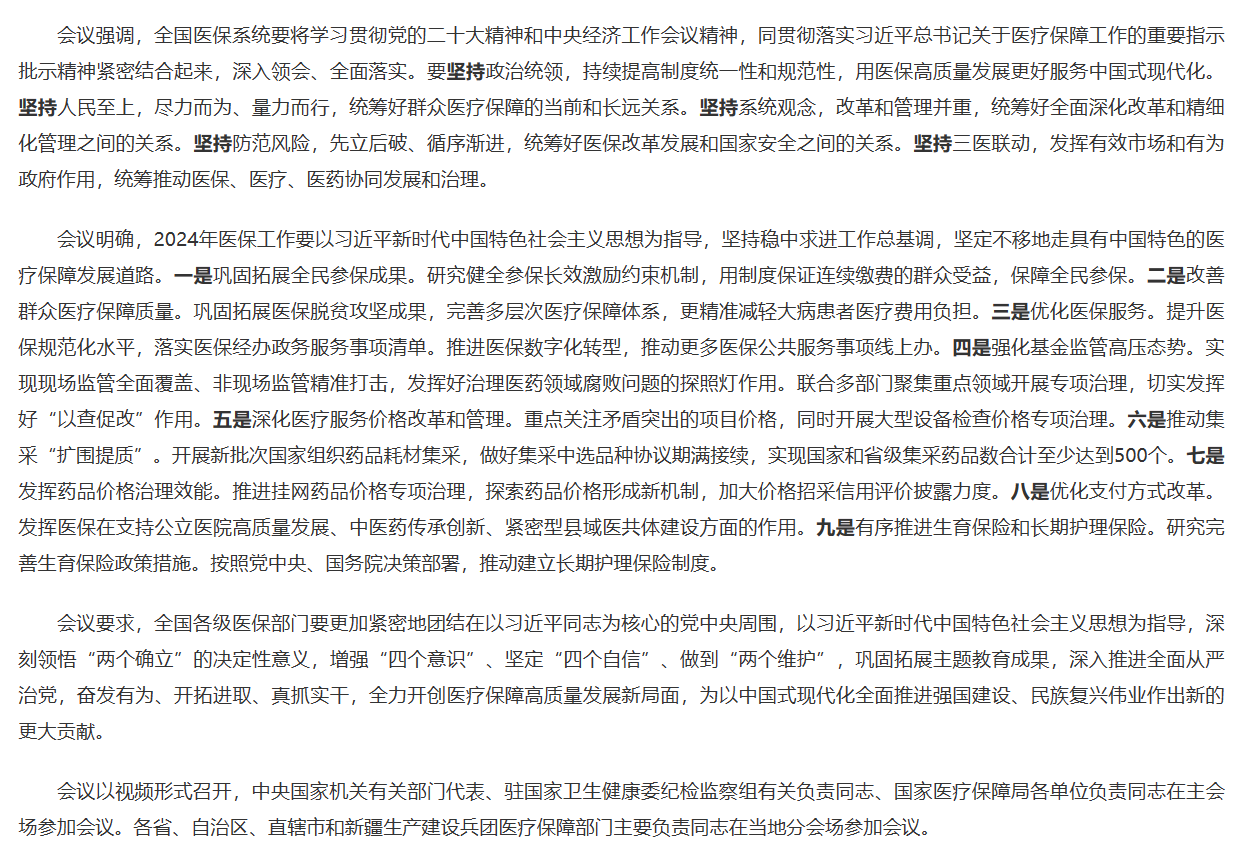 1月9日,全國(guó)醫(yī)療保障工作會(huì)議在京召開。會(huì)議總結(jié)2023年醫(yī)保工作,分析醫(yī)保工作形勢(shì),研究部署2024年工作。
