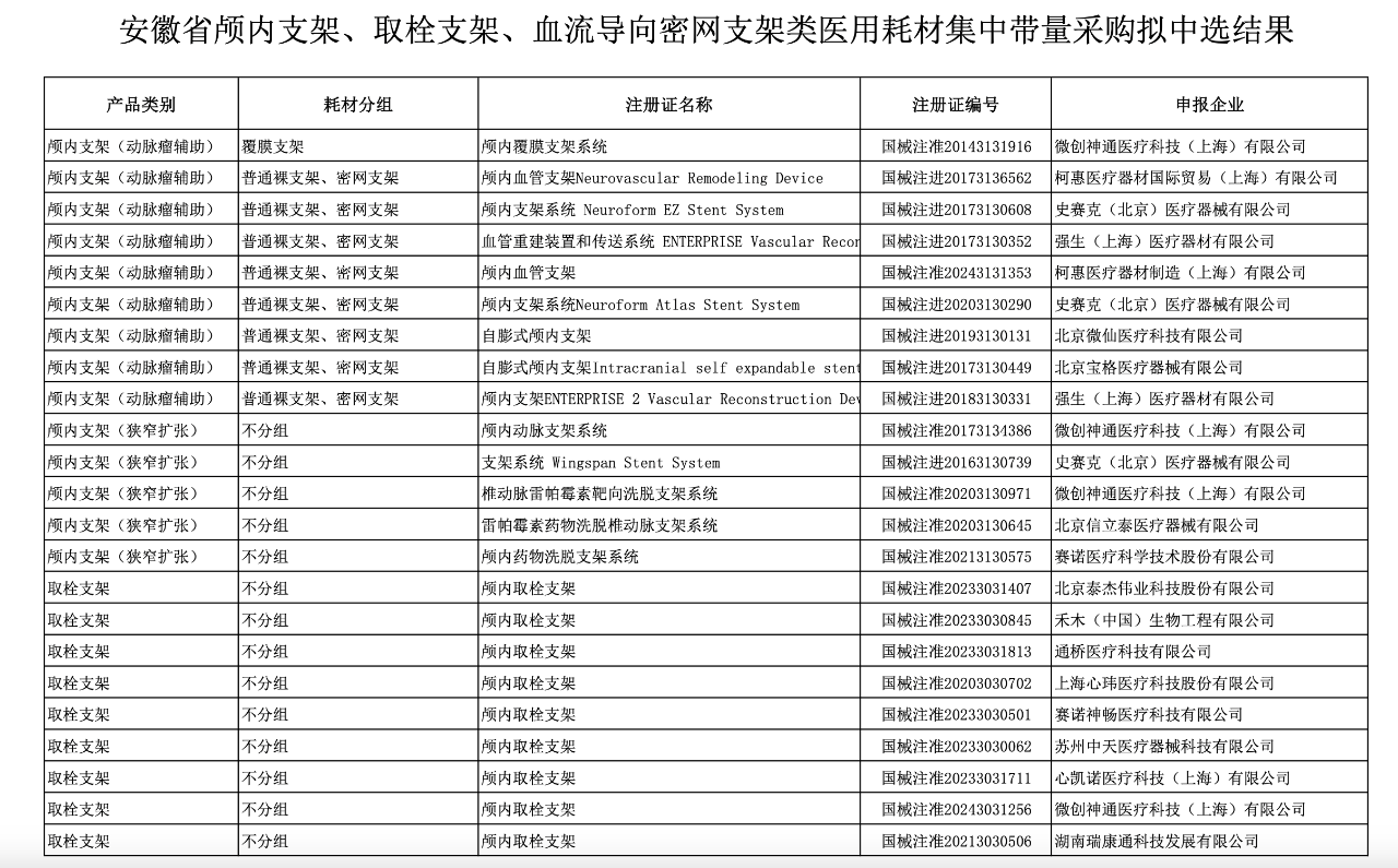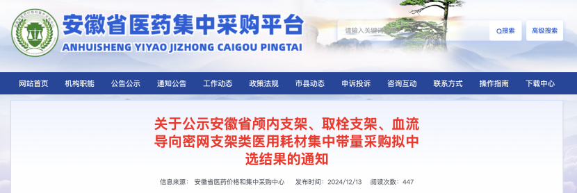 12月13日,安徽省醫(yī)藥集中采購平臺(tái)發(fā)布《關(guān)于公示安徽省顱內(nèi)支架、取栓支架、血流導(dǎo)向密網(wǎng)支架類醫(yī)用耗材集中帶量采購擬中選結(jié)果的通知》,于2024年12月13日至2024年12月17日17:30進(jìn)行公示。