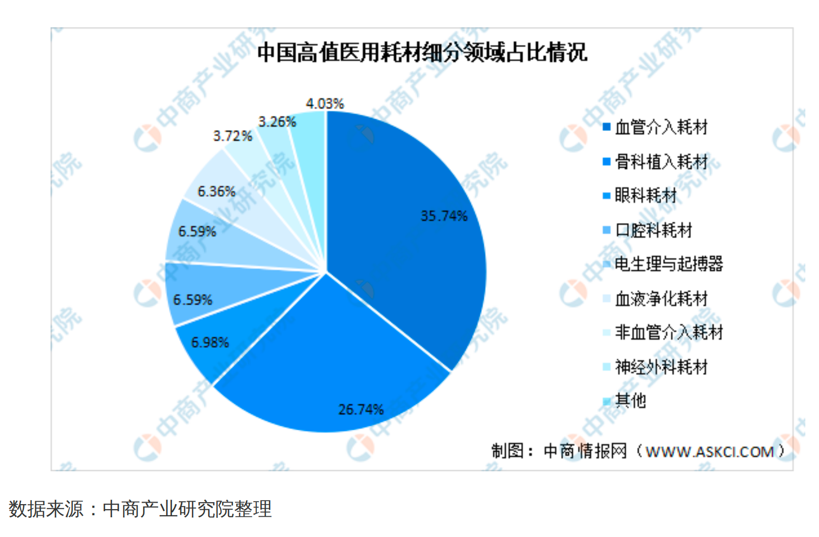 據(jù)中商產(chǎn)業(yè)研究院統(tǒng)計,高值醫(yī)用耗材細分市場中,2019年血管介入耗材規(guī)模為461億元,占比35.74%,是占比最高的細分市場。