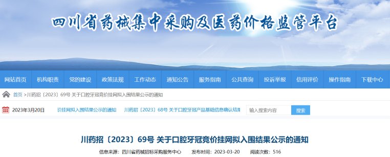 今日(3月20日),四川省藥械招標采購服務(wù)中心發(fā)布《關(guān)于口腔牙冠競價掛網(wǎng)擬入圍結(jié)果公示的通知》