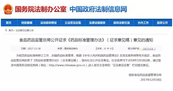 12月18日,國家食藥監(jiān)管總局通過國務(wù)院法制辦公室官網(wǎng)發(fā)布《藥品標(biāo)準(zhǔn)管理辦法》(征求意見稿)(以下簡稱“征求意見稿”)。