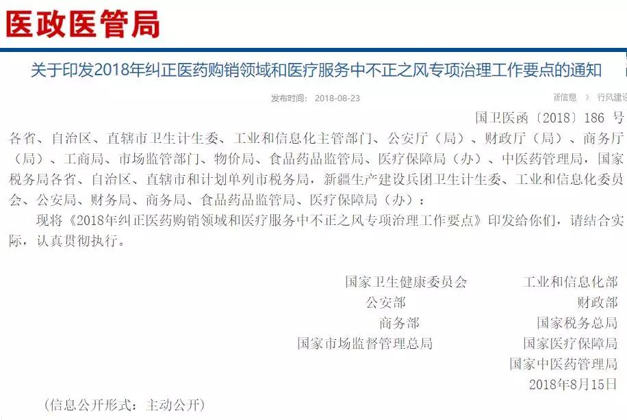 8月23日,國家衛(wèi)健委、國家醫(yī)保局、市場總局、公安部、等九部委聯(lián)合印發(fā)《2018年糾正醫(yī)藥購銷領(lǐng)域和醫(yī)療服務(wù)中不正之風(fēng)專項治理工作要點》(下稱《整治要點》)。