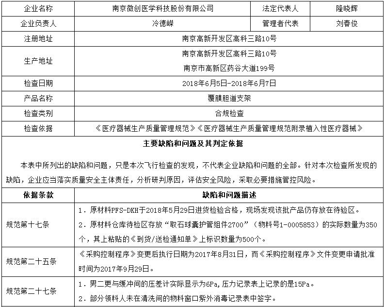 對(duì)南京微創(chuàng)醫(yī)學(xué)科技股份有限公司飛行檢查通報(bào)