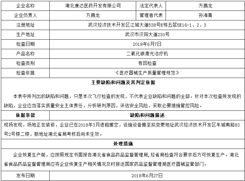 對(duì)湖北康達(dá)醫(yī)藥開發(fā)有限公司飛行檢查通報(bào)