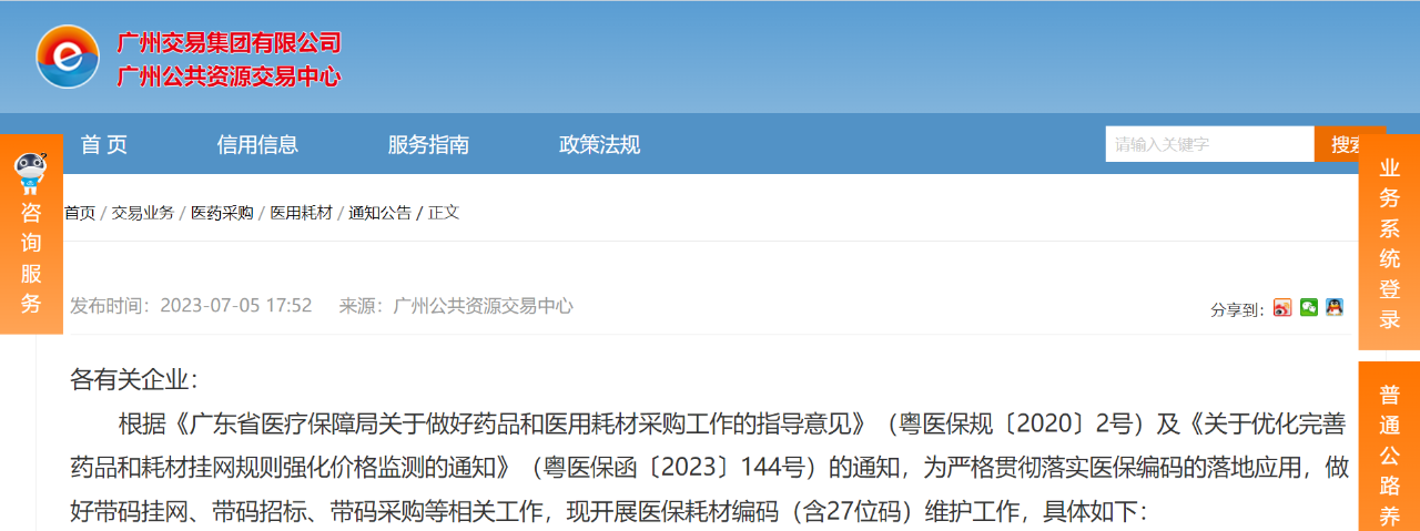 7月5日,廣東省廣州公共資源交易中心也發(fā)布了《關于開展產(chǎn)品醫(yī)保耗材編碼更新維護工作的通知》。